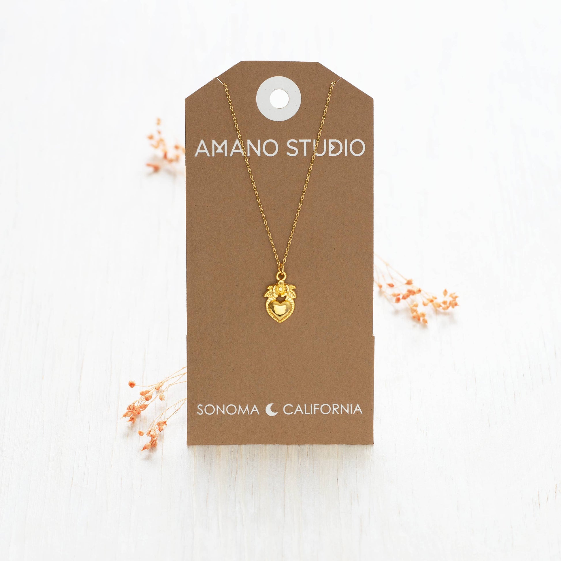 Adorable folk heart charm hangs on a 20" fine cable chain with a sliding adjuster. Made of 14k gold plated brass + coated to resist tarnish.