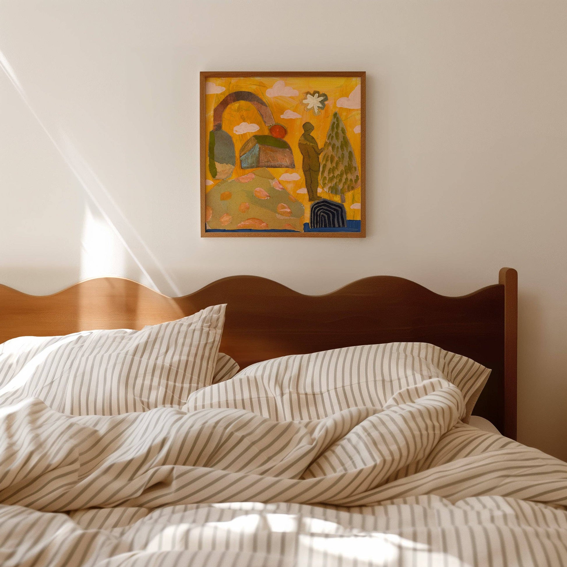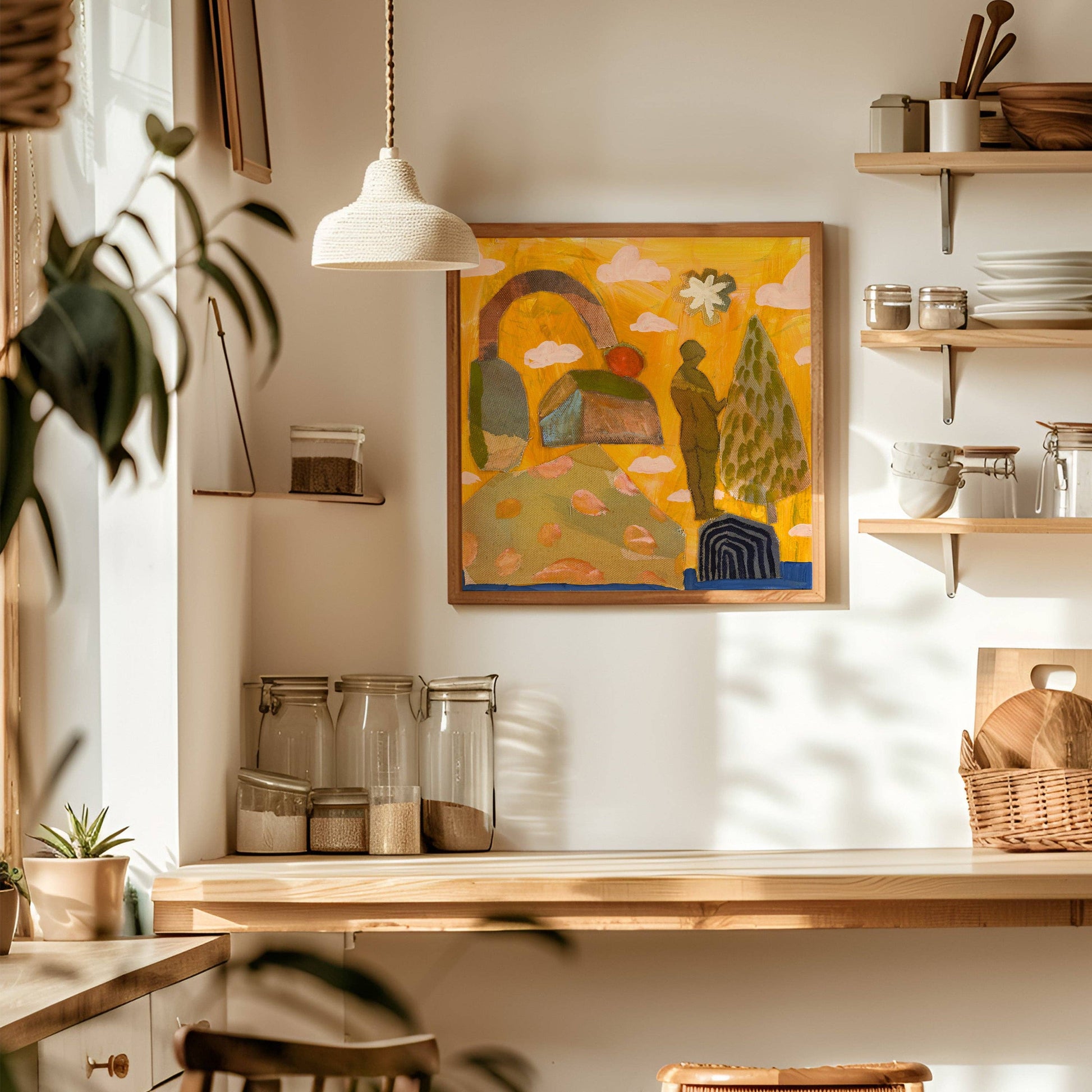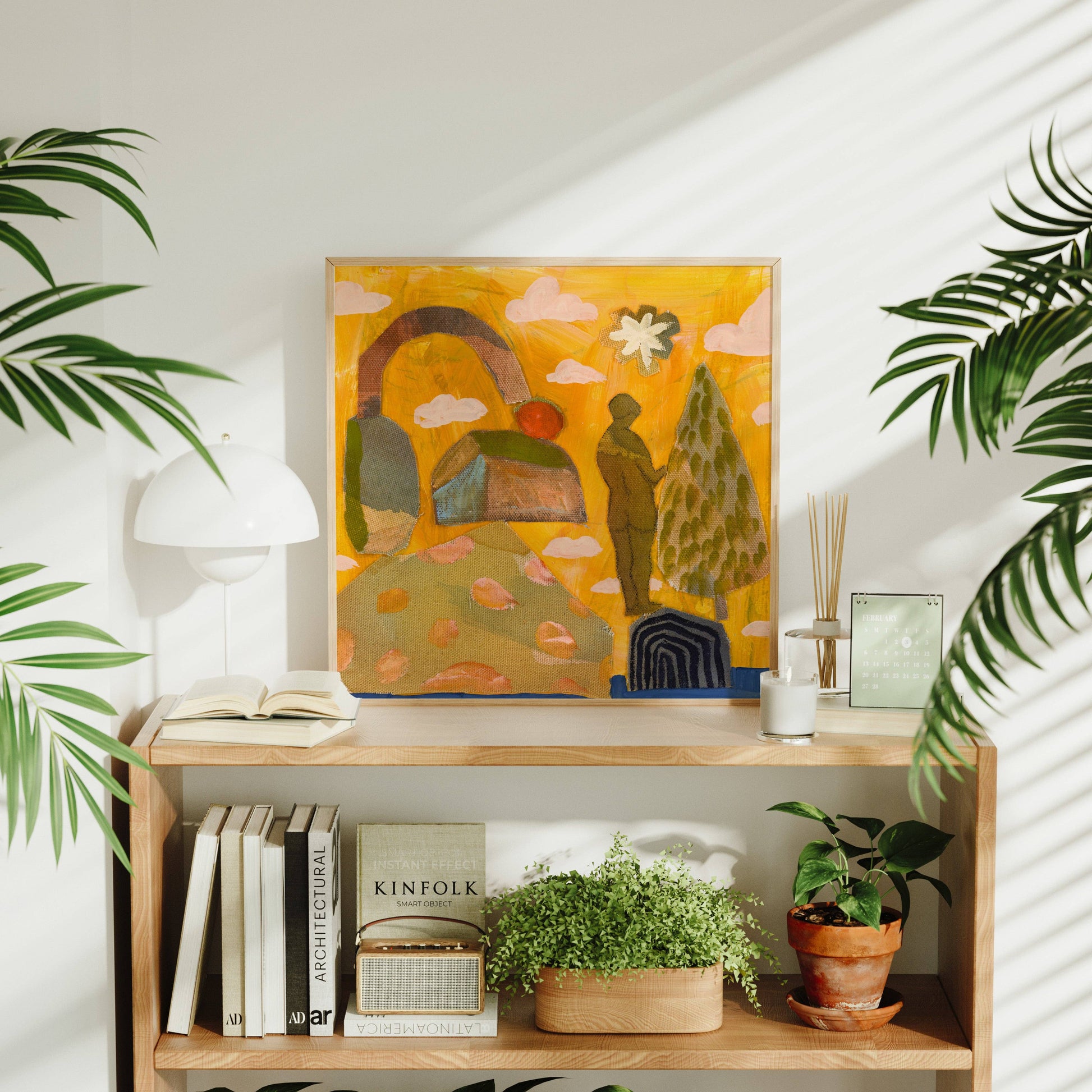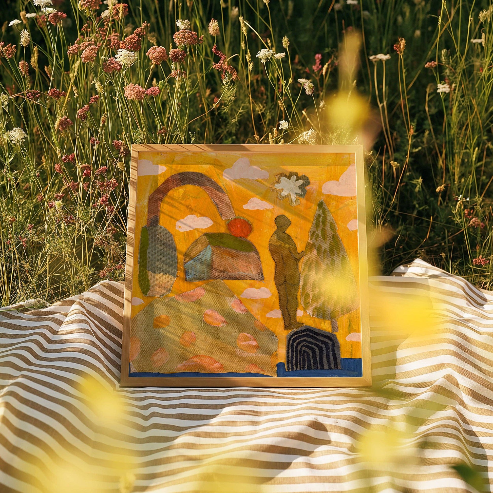 Introduce a touch of retro charm to your home decor with this abstract art print. Featuring a midcentury-inspired collage of forest, landscape and figures, this vintage piece will add a boho folk vibe to any room. THERE ARE NO BORDERS. THE ARTWORK IS PRINTED TO THE EDGES. Prints: Original art is acrylic on canvas. This high-quality fine art giclee print captures textures and detail. Museum-quality posters are made on thick and durable matte paper. • Paper thickness: 10.3 mil • Paper weight: 5.6 oz/y² (192 g/m²) • Giclée printing quality • Opacity: 94% For DIY frame recommendations, please check my website: https://elbakerart.com/pages/frame-recommendations