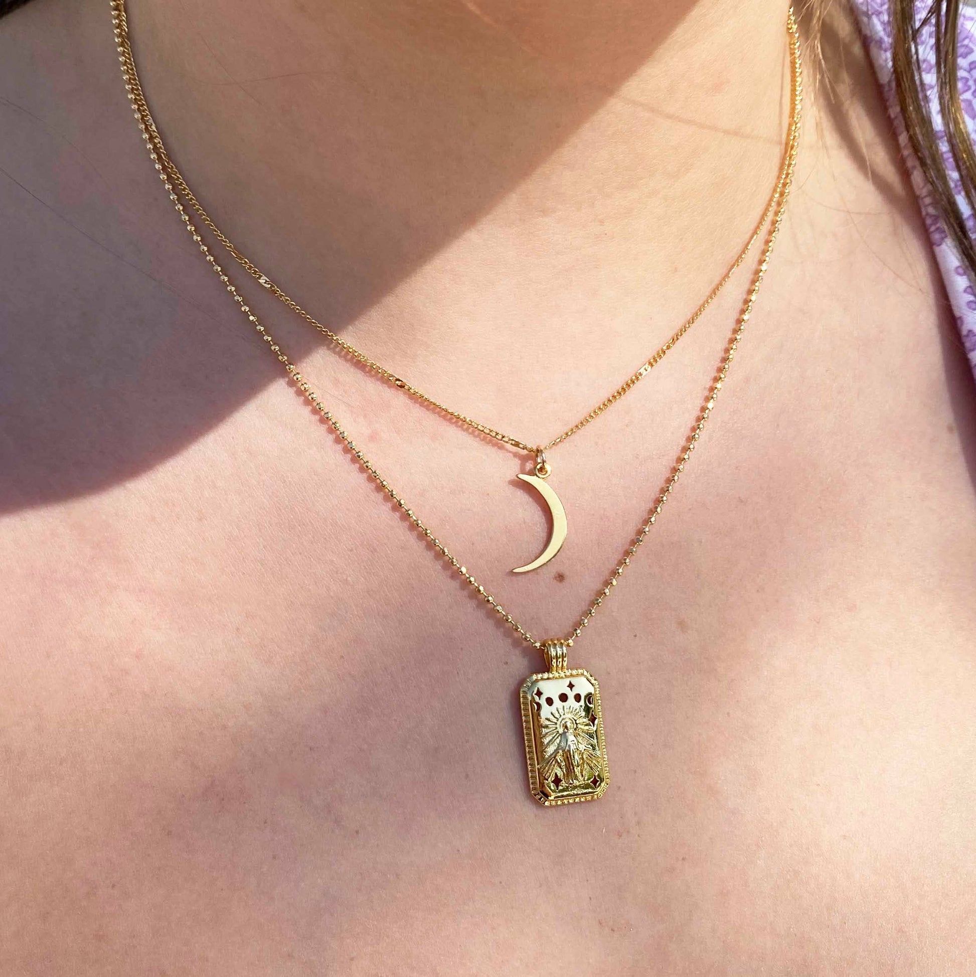 A delicate crescent moon 🌙 charm hangs on a Gold Filled chain.