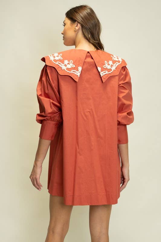 This mini shirt dress features an oversized embroidered collar that adds a charming, vintage-inspired flair. Designed with voluminous puff sleeves and a clean button-down front, it combines structure with femininity. A standout piece that's a stylish twist on a classic silhouette. Model is 5'10" and wearing a size Small. Measurements: Bust 34B / Waist 24.5" / Hips 36"
