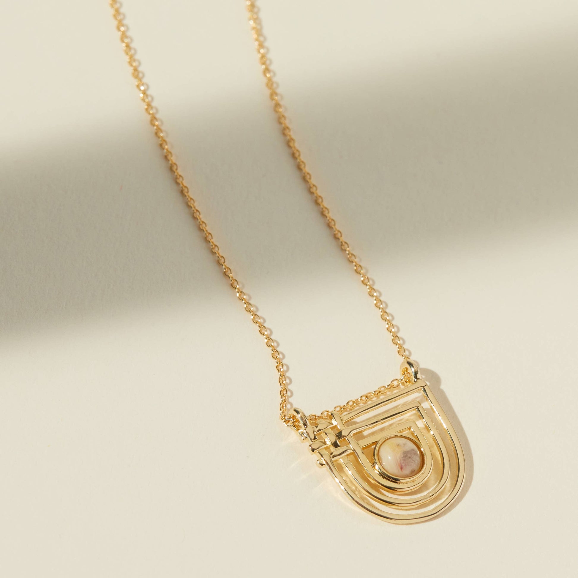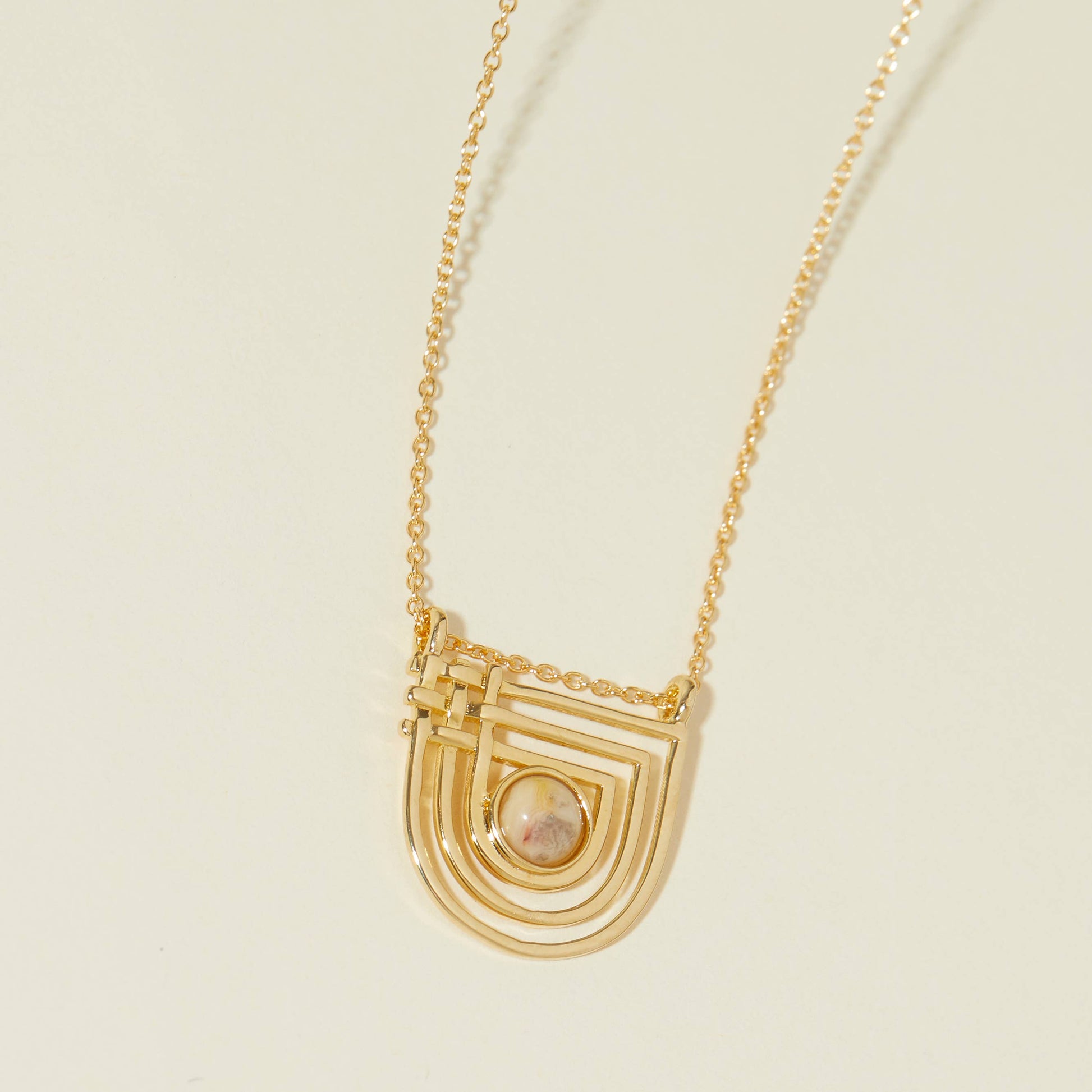 enter your own golden era with this piece featuring 14k gold filled chain in 16” or 18” options, gold-plated pendant with a curved and crosshatch pattern. neutral, crazy lace agate stone in the center.