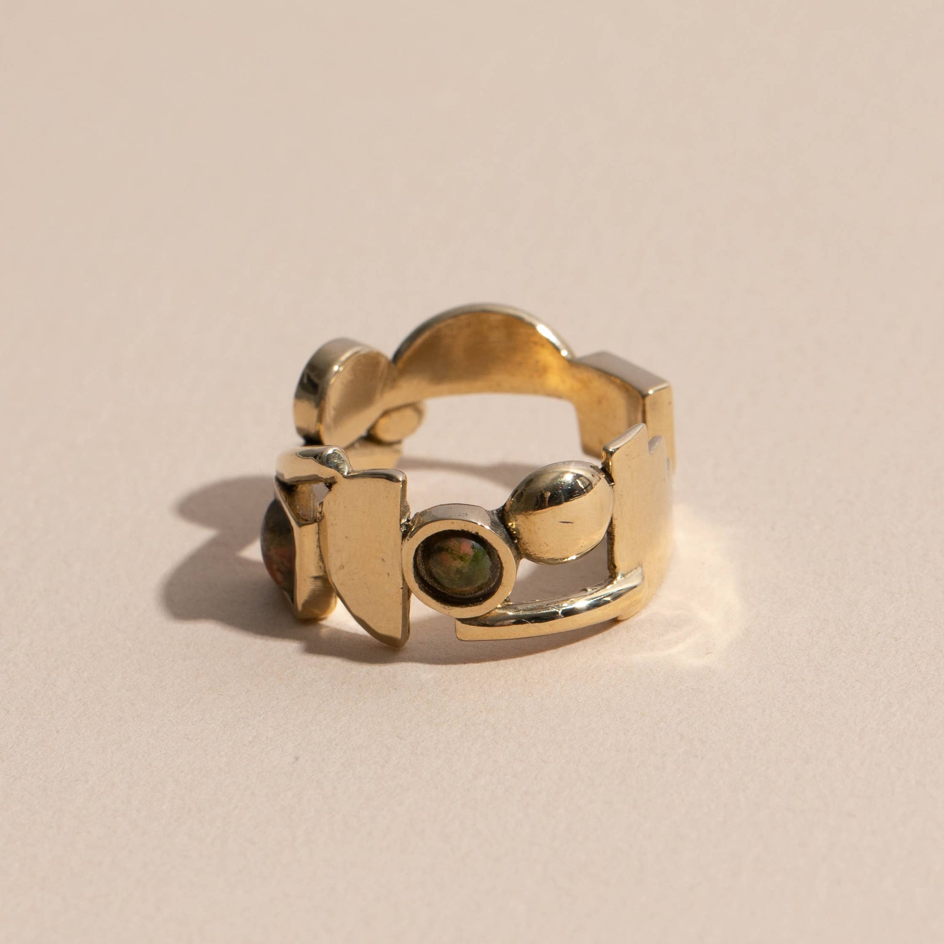 Far outside the ordinary. Shapes ring features a collection of circle and square unakite stones wrapped around metallic semi-circle, rectangle and bar shapes. Comes in both solid brass and sterling silver.