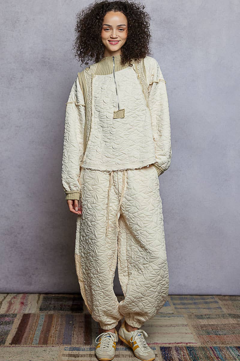 Pol Clothing - Long sleeve solid stitch edge quilted woven hoodie top: CHARCOAL / L