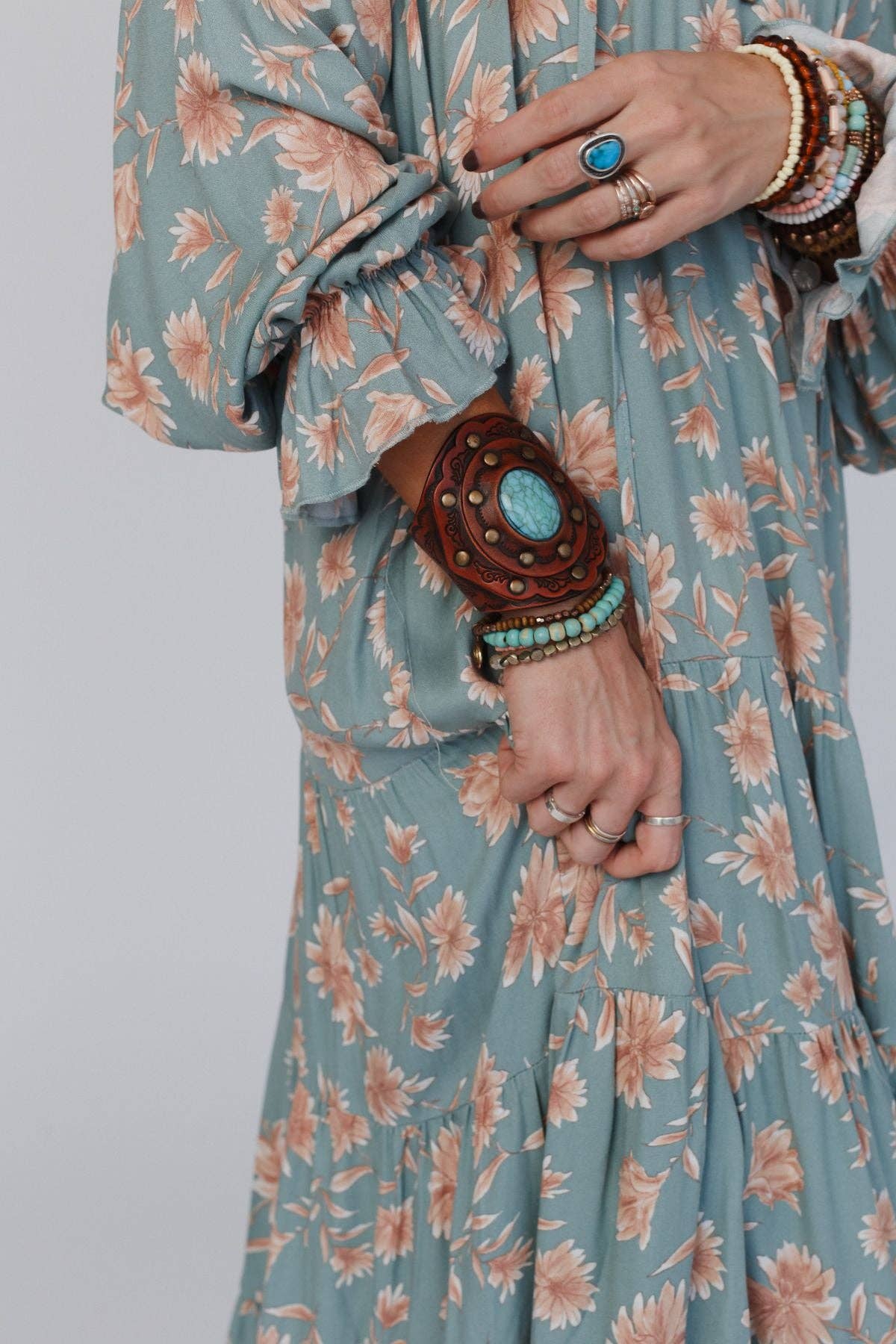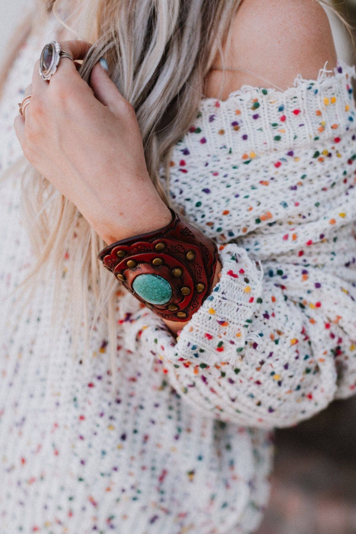 A gorgeous leather cuff speaks to your boho western spirit and this wide statement-band comes in an array of stones like the colors of the Aegean Sea. Brassy rivets accent circles of tooled leather that are tanned to flatter each stone. The snap is inscribed with the Three Bird Nest logo and a double closure lets you choose the fit you like for this timeless piece.